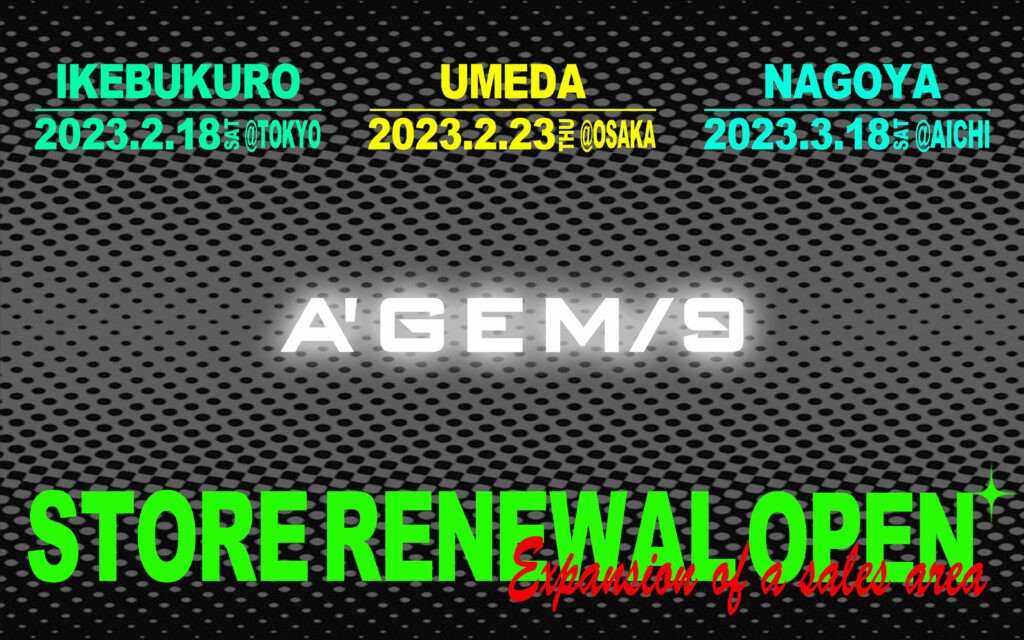 インポート&韓国ブランドを取り扱うストリートセレクトショップA'GEM/9が、 池袋PARCO・梅田HEP FIVE・名古屋PARCOの3店舗をリニューアルオープン致します。